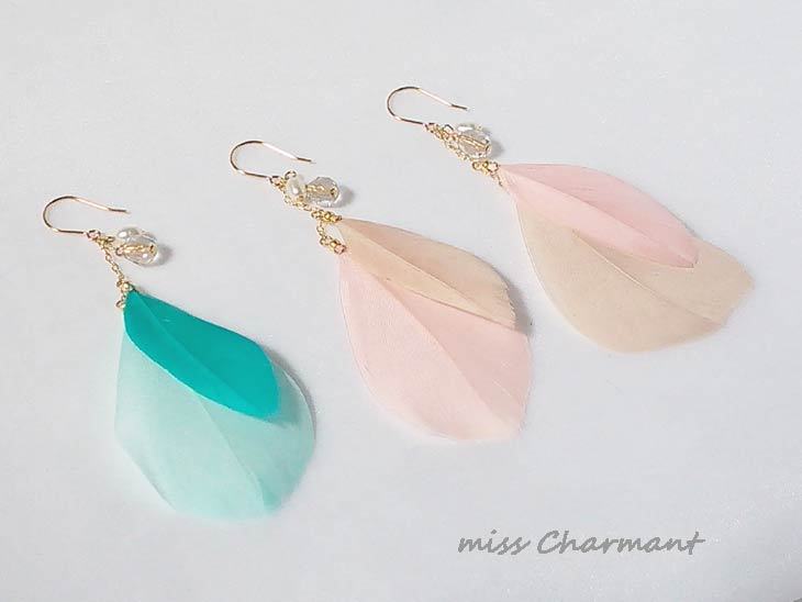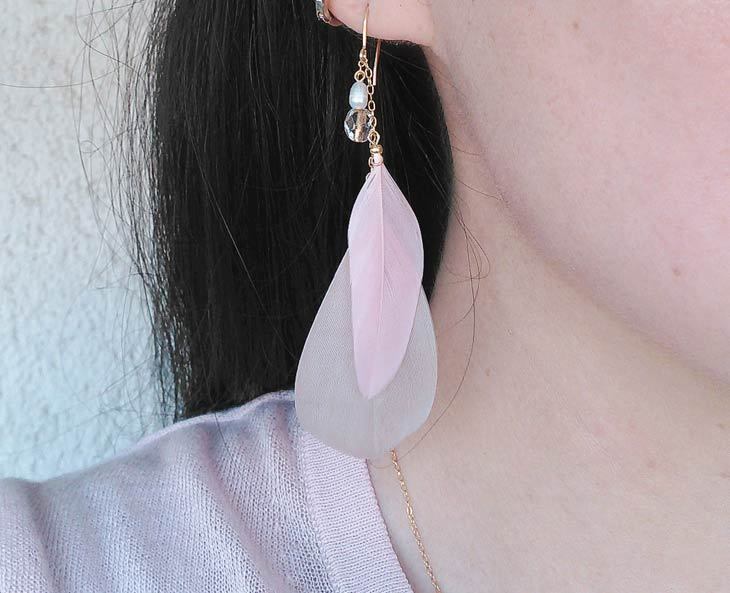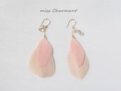 2色の羽のシャンデリアピアス ベージュピンク