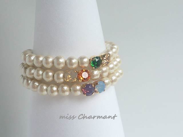 再販♪スワロ×コットンパールのブレスレット オフホワイト×オレンジ