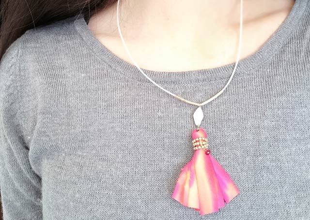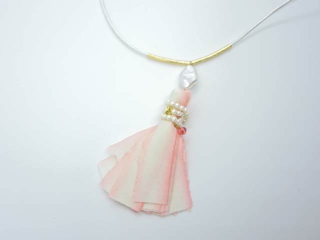 マーブルカラーのシルクリボンをタッセル風にまとめて人魚をイメージしてみました。