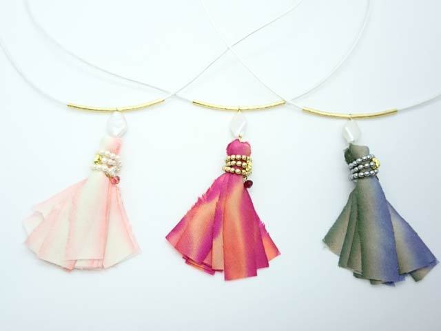 マーブルカラーのシルクリボンをタッセル風にまとめて人魚をイメージしてみました。