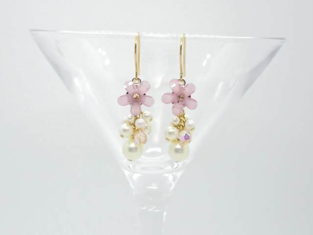 お花のチャームの下には色々な種類や大きさのパールがゆらゆら・・・